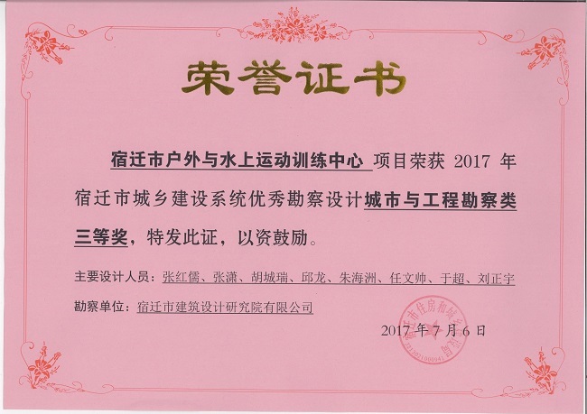 2、宿遷市戶外與水上運動訓(xùn)練中心項目中獲城市與工程勘察類三等獎